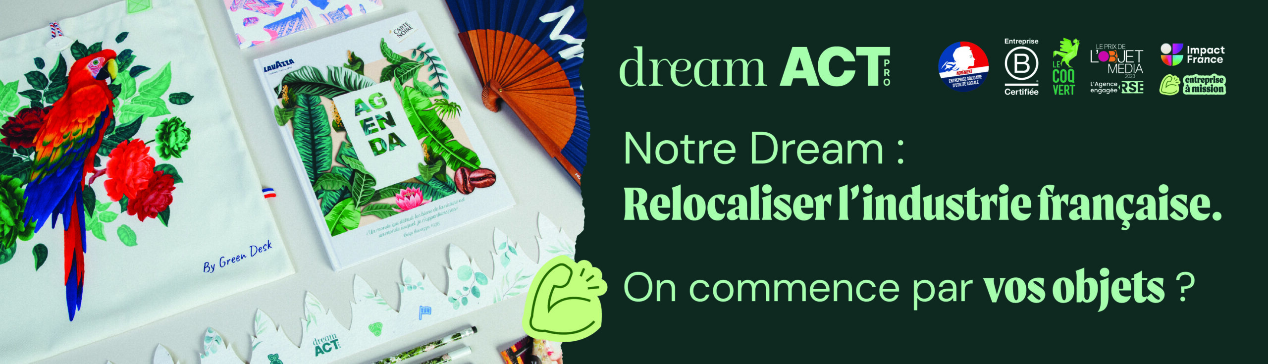 Dream Act accompagne les organisations qui souhaitent des objets médias plus responsables, en privilégiant des produits utiles, durables et fabriqués localement. Notre ambition : démontrer qu’il existe en France des alternatives engagées grâce à notre réseau de plus de 800 ateliers partenaires.