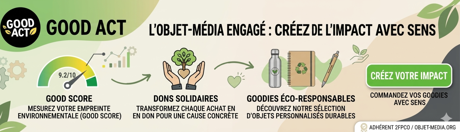 Good Act est un acteur engagé qui révolutionne l’objet-média en plaçant l’éthique au cœur de chaque personnalisation. Fier adhérent de la Fédération de la communication par l’objet et présent sur objet-media.org, notre plateforme transforme vos goodies en véritables vecteurs de changement positif grâce à une transparence absolue. Nous avons créé le Good Score pour vous permettre de piloter votre impact environnemental d’un seul coup d’œil, garantissant que chaque cadeau d’affaires respecte les standards les plus exigeants de l’éco-responsabilité. Au-delà de l’objet, chaque commande chez Good Act alimente un système de dons dynamique qui soutient directement des causes sociales et environnementales concrètes. Nous prouvons chaque jour que la communication par l’objet peut être à la fois esthétique, performante et profondément solidaire, faisant de votre marque un moteur de bien commun.
